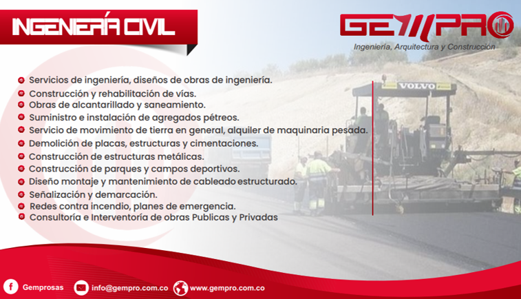 ORGANIZACIÓN GEMPRO S.A.S Reúne expertos en el campo de la Ingeniería, Arquitectura y Construcción, amplia experiencia en el sector, innovando, dirigiendo y ejecutando importantes obras en todo el territorio nacional. Construimos el FUTURO de Colombia.