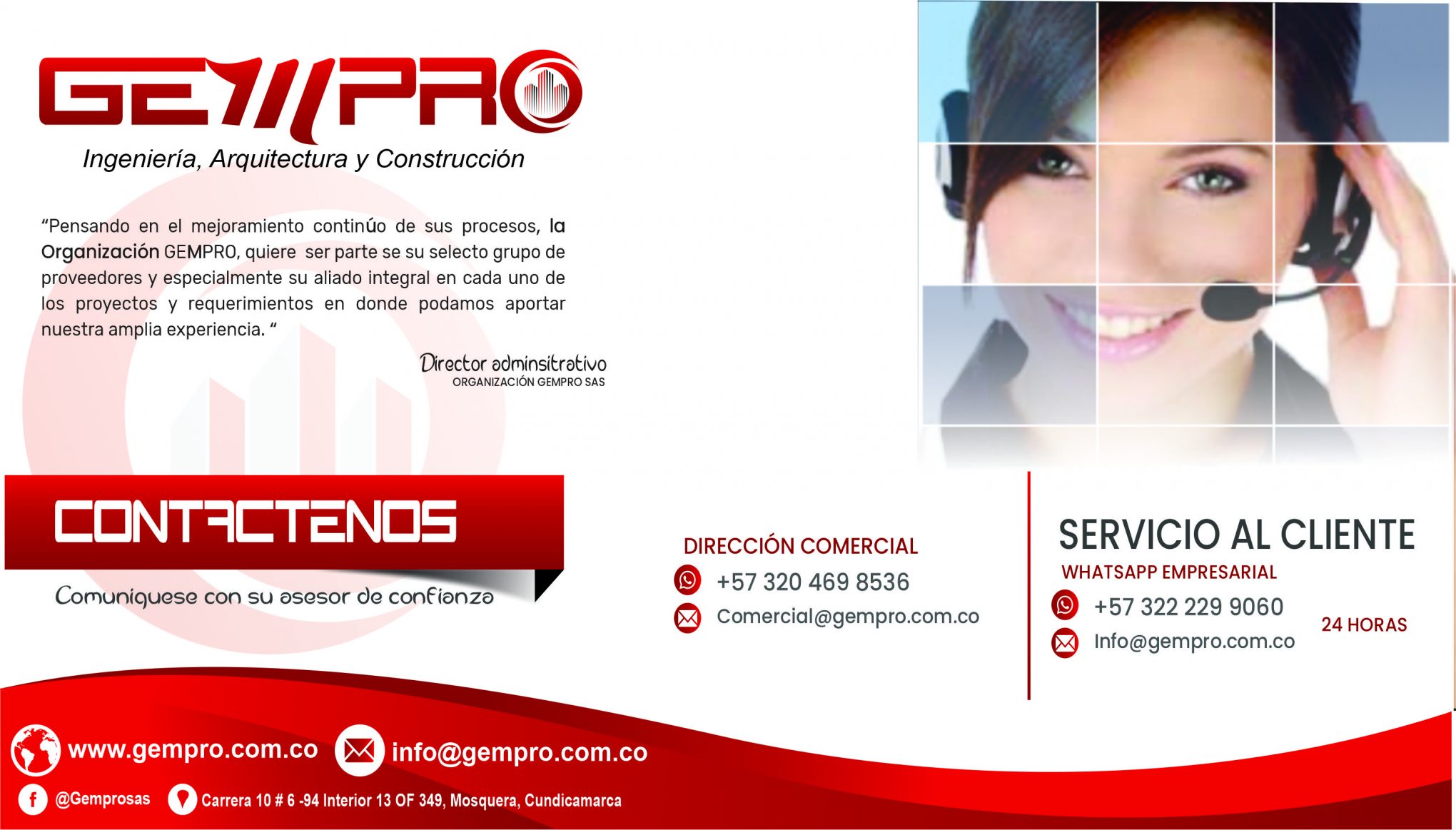 “Pensando en el mejoramiento continúo de sus procesos, la ORGANIZACION GEMPRO S.A.S, quiere ser parte se su selecto grupo de proveedores y especialmente su aliado integral en cada uno de los proyectos y requerimientos en donde podamos aportar nuestra amplia experiencia“